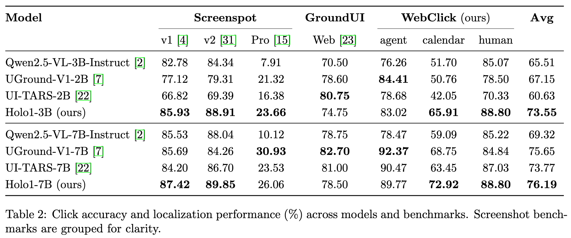 A key skill for the real-world utility of our VLMs within agents is localization: the ability to identify precise coordinates on a user interface (UI) to interact with to complete a task or follow an instruction. To assess this capability, we evaluated our Holo1 models on several established localization benchmarks, including Screenspot, Screenspot-V2, Screenspot-Pro, GroundUI-Web, and our own newly introduced benchmark WebClick.
