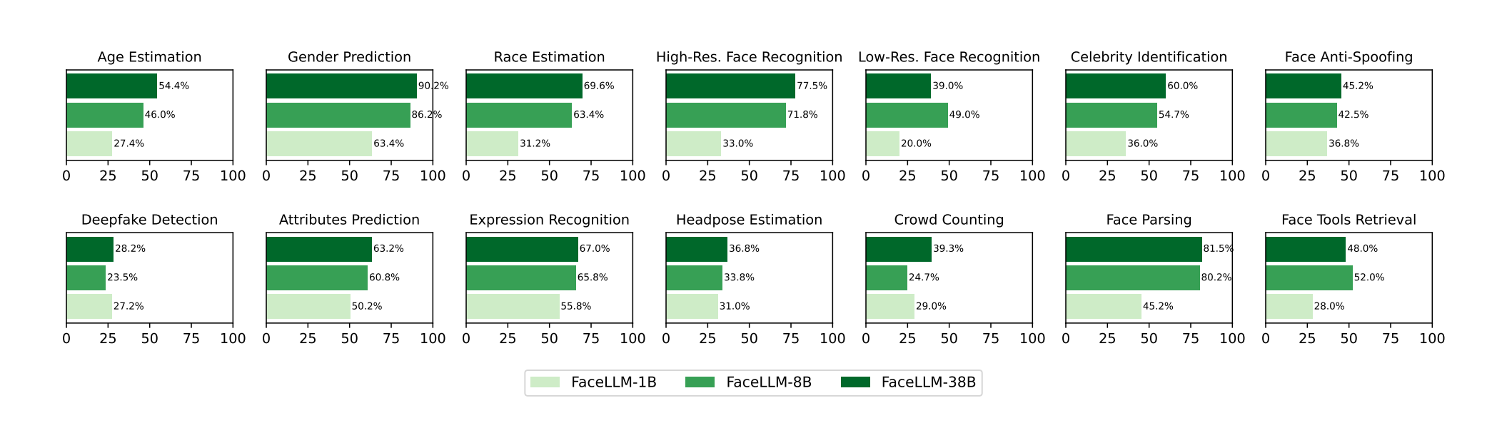 Performance of FaceLLM models (FaceLLM-1B, FaceLLM-8B, and FaceLLM-38B) on different sub-tasks, including age estimation, gender prediction, race estimation, high-resolution face recognition, low-resolution face recognition, celebrity identification, face anti-spoofing, deepfake detection, attributes prediction, facial expression recognition, headpose estimation, face localization crowd counting, face parsing, and face tools retrieval.