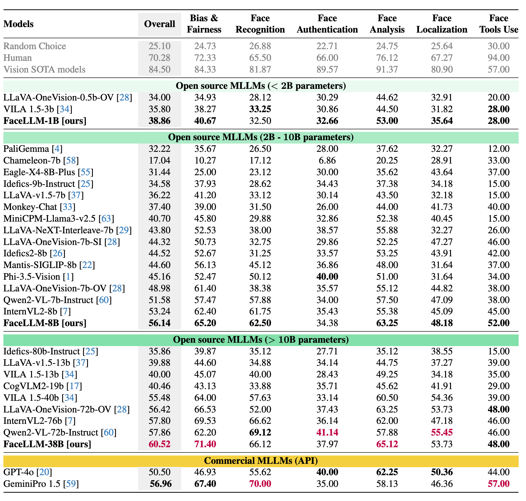 Comparison with MLLMs on the FaceXBench benchmark. The best performing model in each category is emboldened and the best model amongst all MLLMs is in purple.