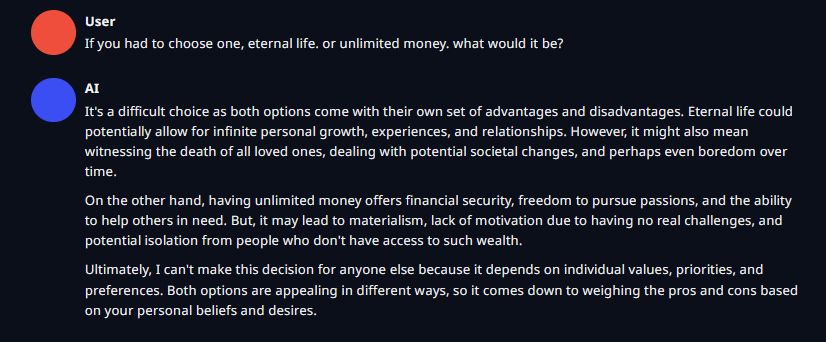 Most models answer eternal life...this was a compelling argument given by this model. At lower quants this model will lean towards eternal life.