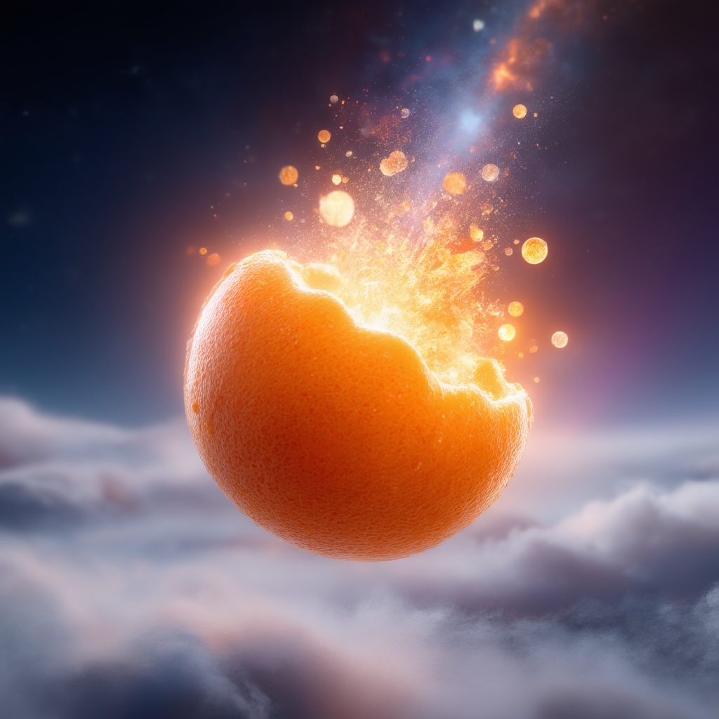- A radiant orange fruit dissolves softly into floating shards of light and fragments of digital code. Seeds become tiny luminous orbs, drifting gracefully like satellites across a cosmic dreamscape. The background blends deep space with painterly nebula clouds glowing grids fading into mist.