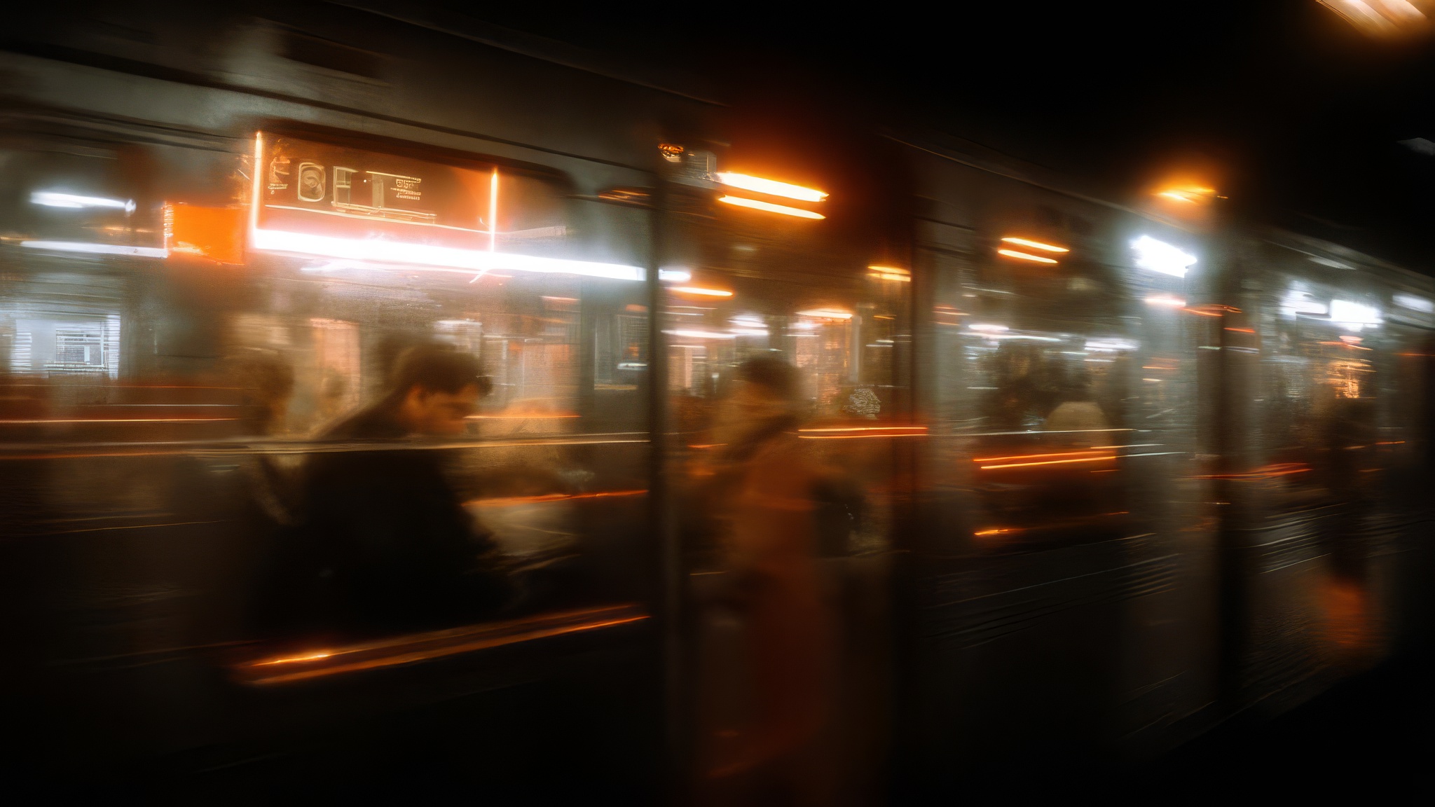 - The subway hums with life as it rushes through the city, its windows glowing with reflections of neon signs and passing lights. Inside the train is crowded with passengers some leaning wearily against poles, others lost in the blur of their own thoughts while outside the glass, streaks of orange from streetlamps and city towers smear across the wet night. The motion of the train carries the same restless energy as the streets above echoing with the rhythm of wheels on steel and the subtle sway of bodies moving together capturing the architecture movement and pulse of an urban night that never truly rests.