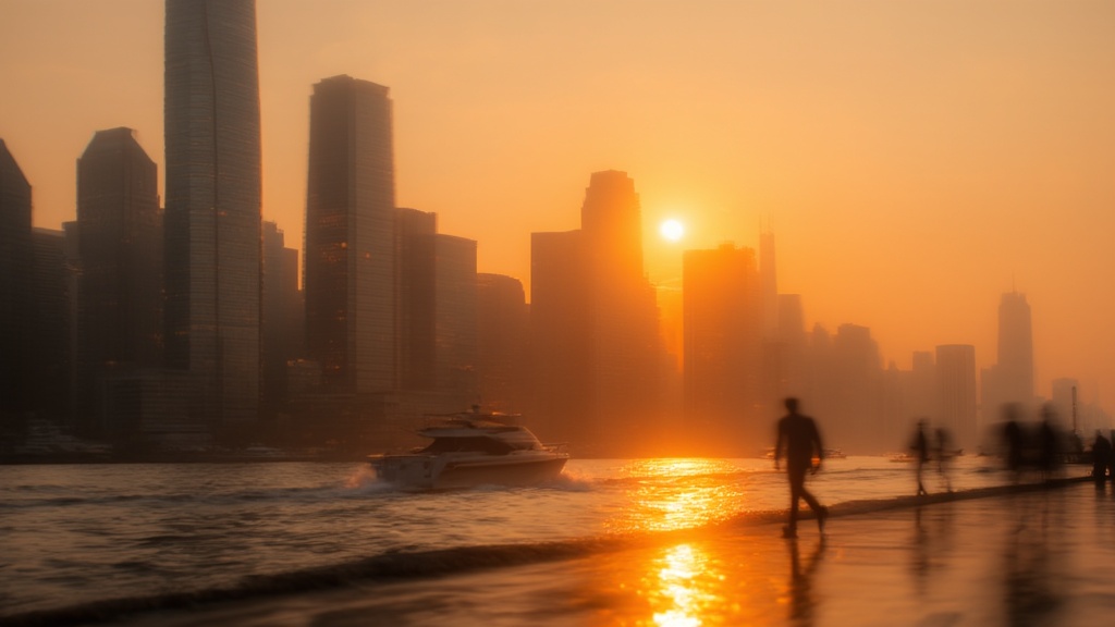 - The harbor at sunset golden orange glow flooding the water. Boats drift and cut across the harbor their wakes catching the light in blurred shimmering trails. The skyline rises behind in layered silhouettes glass towers reflecting the fire of the setting sun, glowing with depth and contrast. Along the waterfront figures walk in soft motion blur their outlines glowing against the orange haze. Reflections ripple across wet pavement and waves balancing stillness and motion the whole scene brooding beautiful an urban symphony of architecture water and light bound together in the fading day.