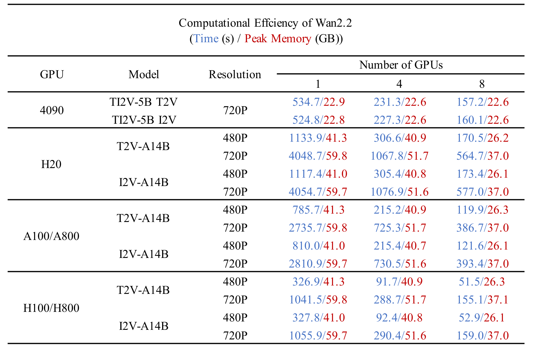 We test the computational efficiency of different Wan2.2 models on different GPUs in the following table. The results are presented in the format: Total time (s) / peak GPU memory (GB).