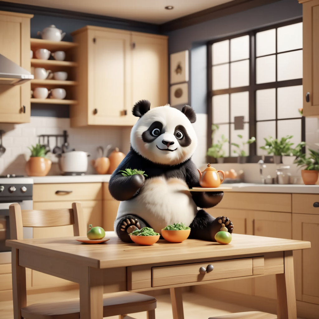 - 3D Render Style, 3DRenderAF, Cute panda on top of a table, kitchen, funny