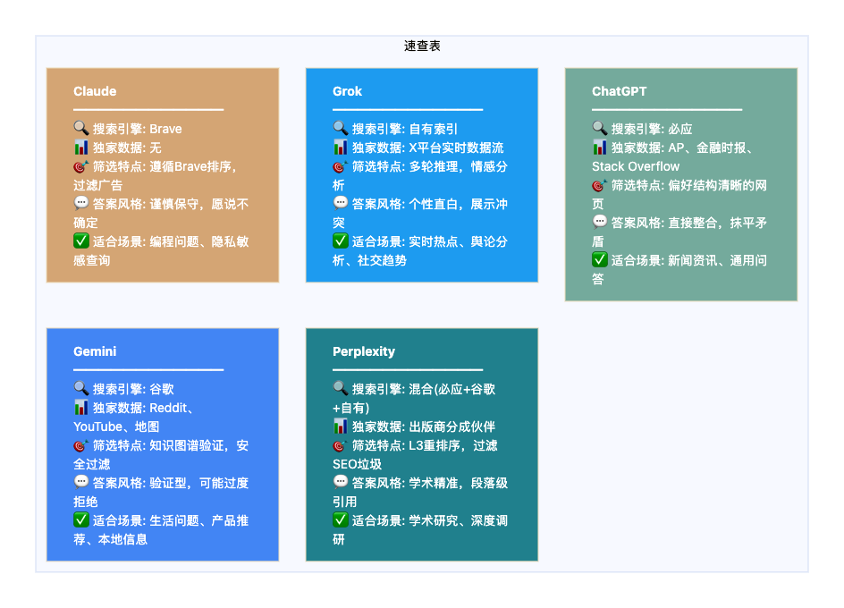 光是搜索引擎的不同,就已经决定了这些AI的"信息视野"存在根本差异。