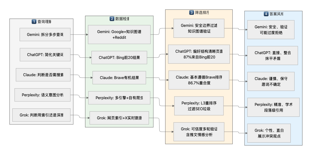 下面这张图直观展示了五个主流AI的搜索架构差异: