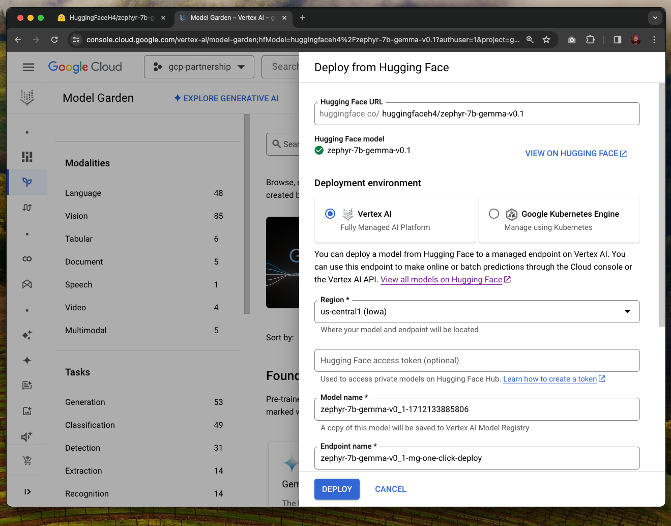 This new experience expands upon the strategic partnership we announced earlier this year to simplify the access and deployment of open Generative AI models for Google customers. One of the main problems developers and organizations face is the time and resources it takes to deploy models securely and reliably. Deploy on Google Cloud offers an easy, managed solution to these challenges, providing dedicated configurations and assets to Hugging Face Models. It’s a simple click-through experience to create a production-ready Endpoint on Google Cloud’s Vertex AI.