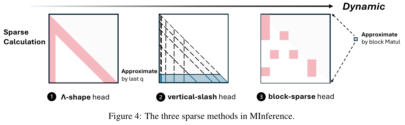 Overall, MInference analyzed the sparse distribution of attention in long-context LLMs and proposed three sparse attention patterns that are easy to accelerate on GPUs, and implemented efficient GPU kernels for each pattern.