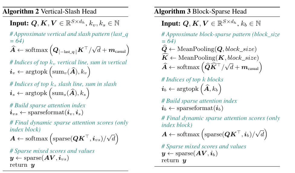 After confirming the type and sparsity rate of the sparse pattern, MInference will dynamically construct sparse indices based on the input: for the vertical-slash pattern, this step is to determine the position of the most important vertical and diagonal lines in the attention matrix; for the block sparse pattern, this step is to find the most relevant blocks from the entire attention matrix.