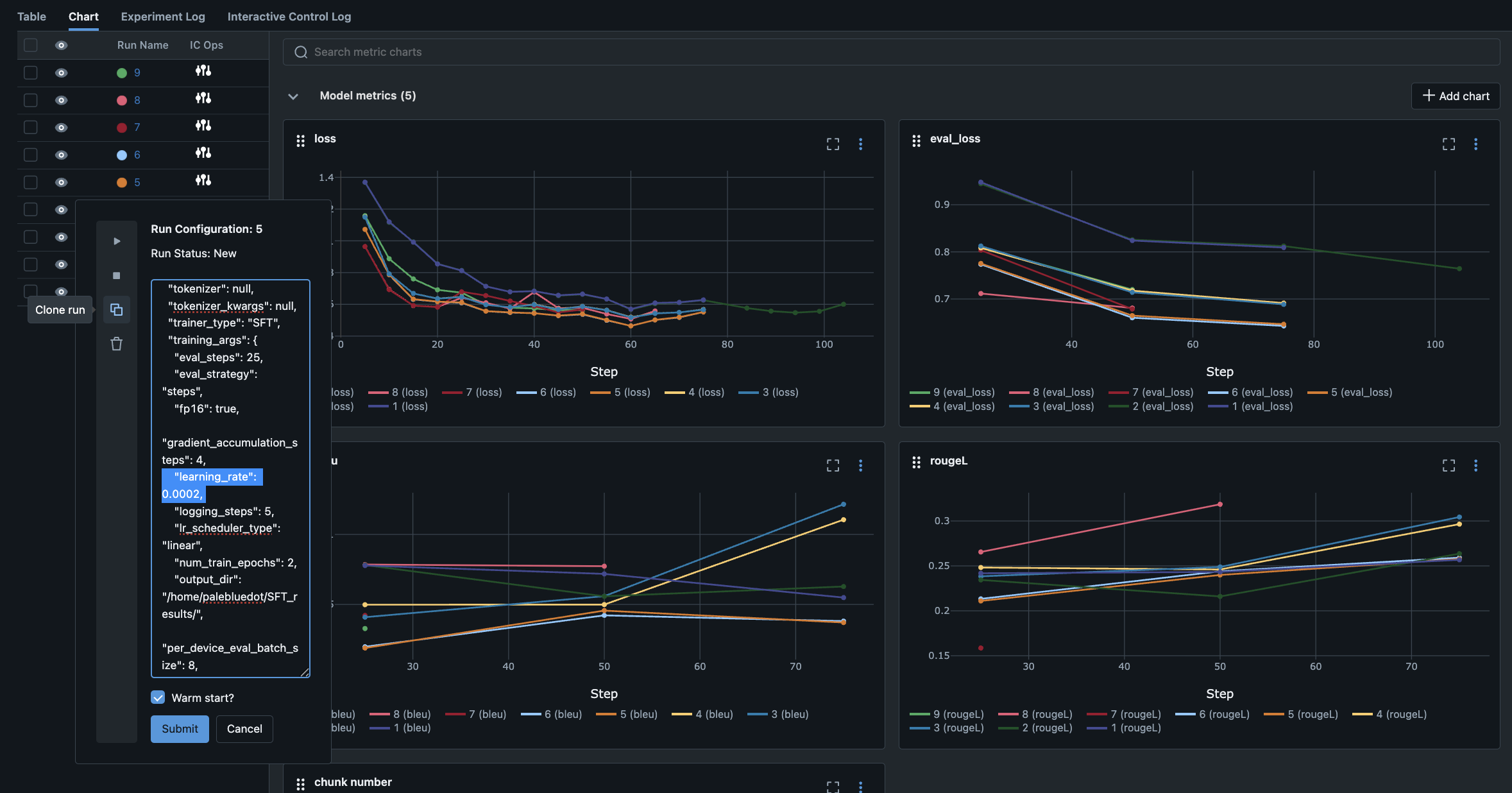 Interactive Control Operations Clone promising configurations with modified hyperparameters, optionally warm-starting from the parent's weights, all from the live dashboard