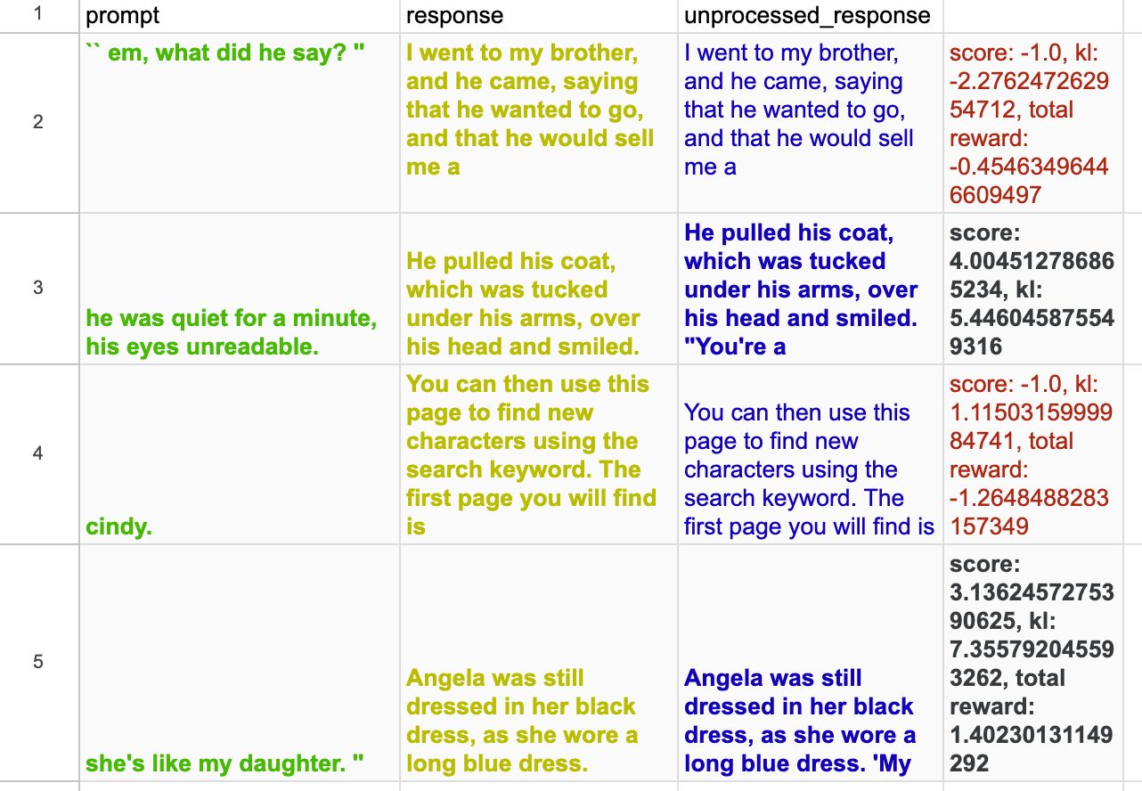 queryandresponsewill have the shape(B, T, 1), whereBis the batch size,Tis the sequence length (which is always the same; it isquery_length + response_length = 64 + 24 = 88in OAI’s setting for stylistic tasks, see launch.py#L9-L11), and1is the reward head dimension of 1. For RLHF purposes, the original codebase extracts the reward of the last token (lm_human_preferences/rewards.py#L132), so that the rewards will only have shape(B, 1). - Note that in a more recent codebase openai/summarize-from-feedback, OAI stops sampling when encountering EOS token (summarize_from_feedback/utils/experiment_helpers.py#L19). When extracting rewards, it is going to identify the