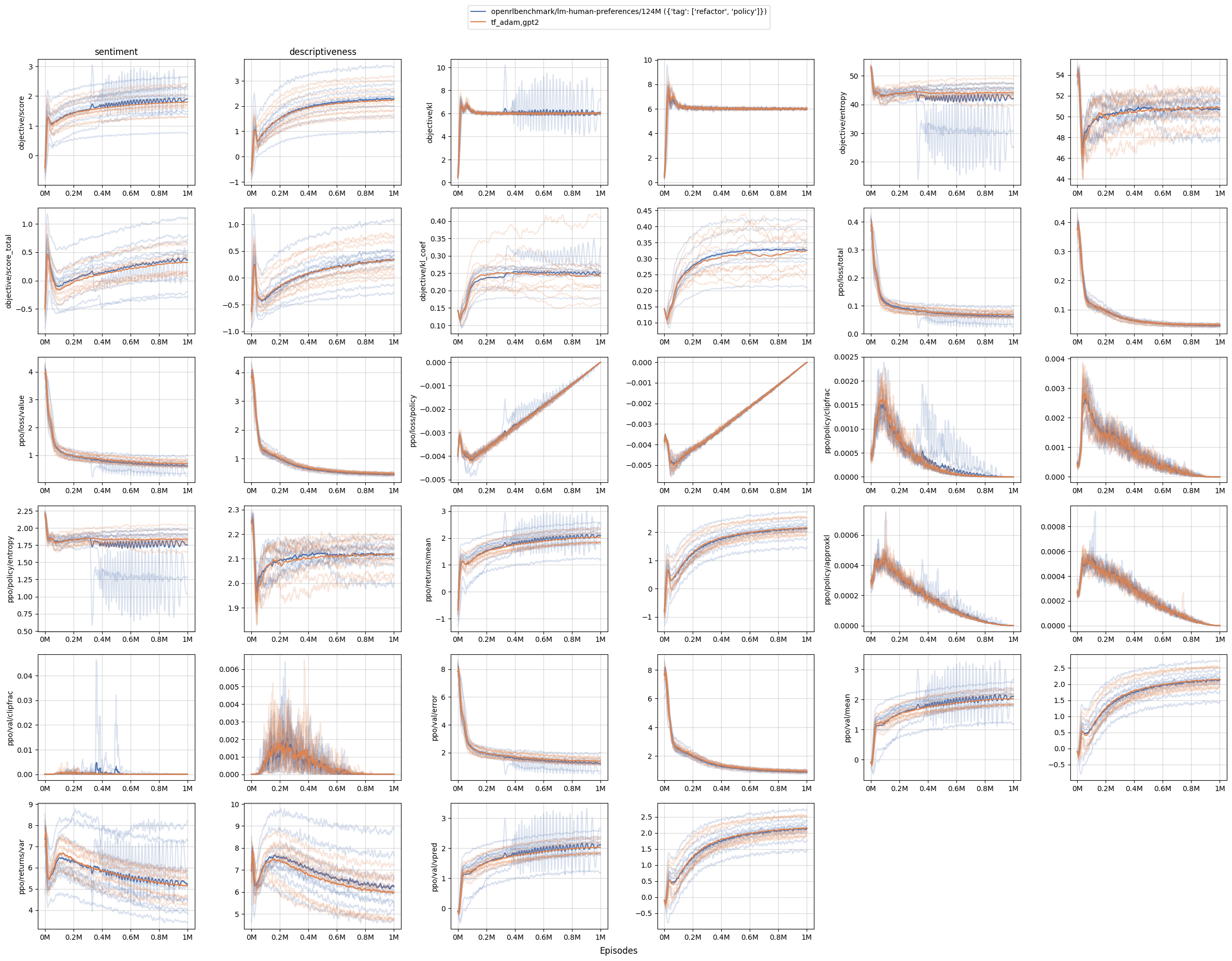Adam(codenamept_adam) and our custom TensorFlow-style (codenametf_adam) withgpt2andgpt2-xl. We found that the performance are roughly similar undergpt2; however withgpt2-xl, we observed a more aggressive updates, meaning that larger models get affected by this issue more.- When the initial policy updates are more aggressive in