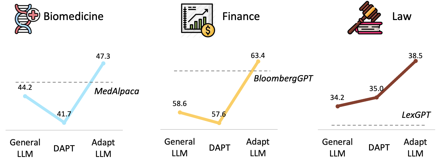 In our paper, we develop three domain-specific models from LLaMA-1-7B, which are also available in Huggingface: Biomedicine-LLM, Finance-LLM and Law-LLM, the performances of our AdaptLLM compared to other domain-specific LLMs are: