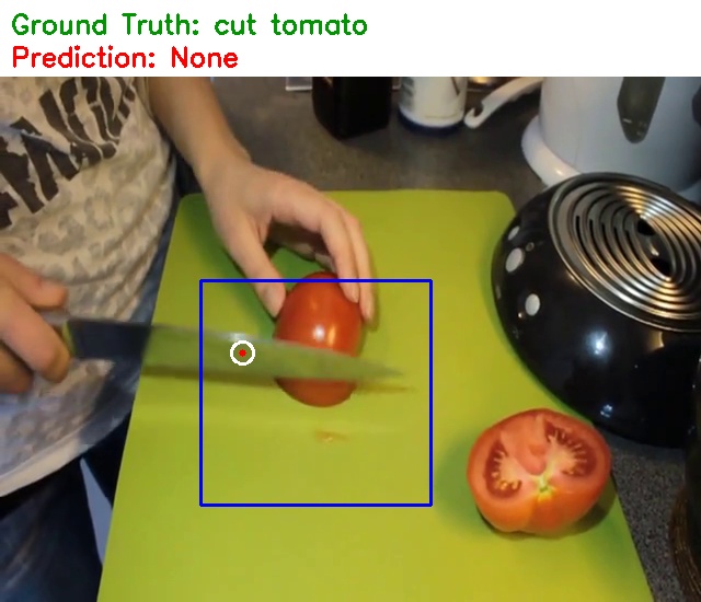 Visualization contains scripts to generate frames with the ground truth box and the predicted point. One should follow the prediction json format given in random_preds.json files. Here are a few visualizations generated: