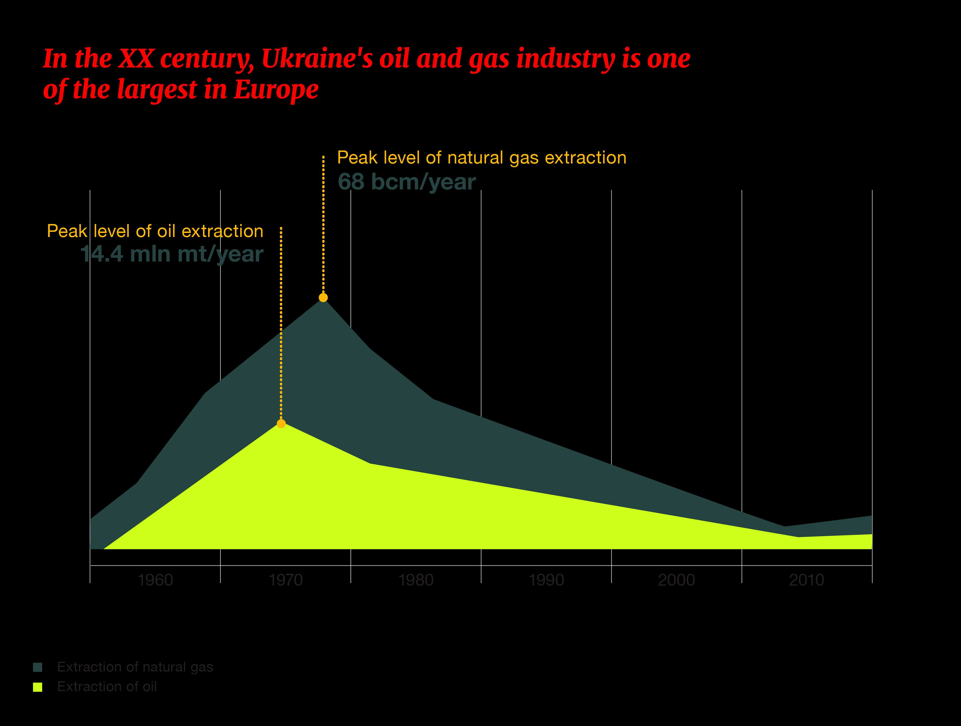 In 1975, annual gas production reached its peak of almost 70 billion cubic metres, more than twice Ukraine’s current total annual gas consumption.