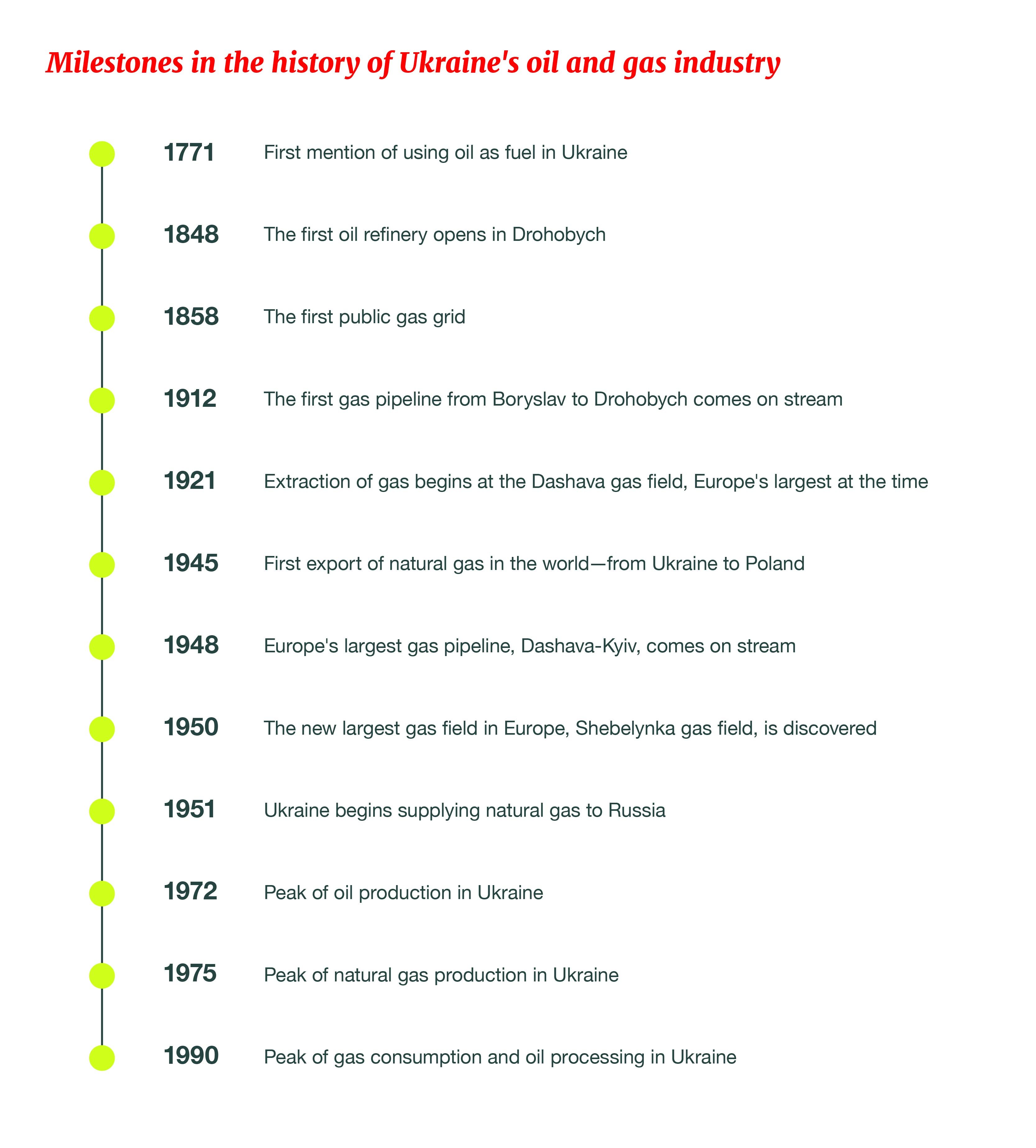 This boom began when the Dashava gas field – ranked as Europe’s largest at the time – and the first gas pipeline were put in service. Ukraine's natural gas industry developed at rates that made it famous throughout Europe and worldwide.