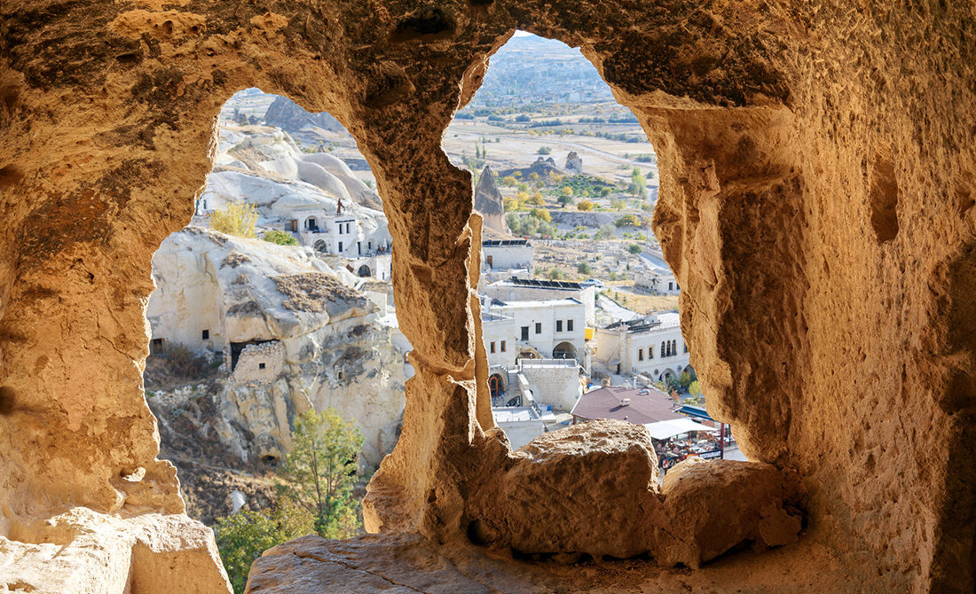 View through carved-out window openings in a cave at the location of the Church of Saint John the Baptist (5th century) in the small village of Çavuşin, Turkey. The Church is located on top of a hill, and is one of the largest and oldest cave churches located in the Cappadocian region of Turkey. newgoreme.com
