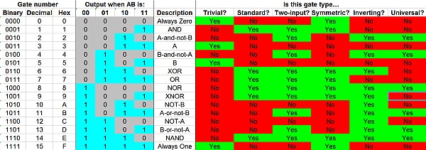 Here is a chart showing the properties of all of the possible behaviors a simple two-input-one-output digital logic gate could exhibit. Some of these are not true “gates”; others are, but lack universality. Interestingly, six of the gate types are universal — meaning that given a sufficient number of them, any other gate type could be created. An entire computer could be created using nothing but NOR gates, for instance.