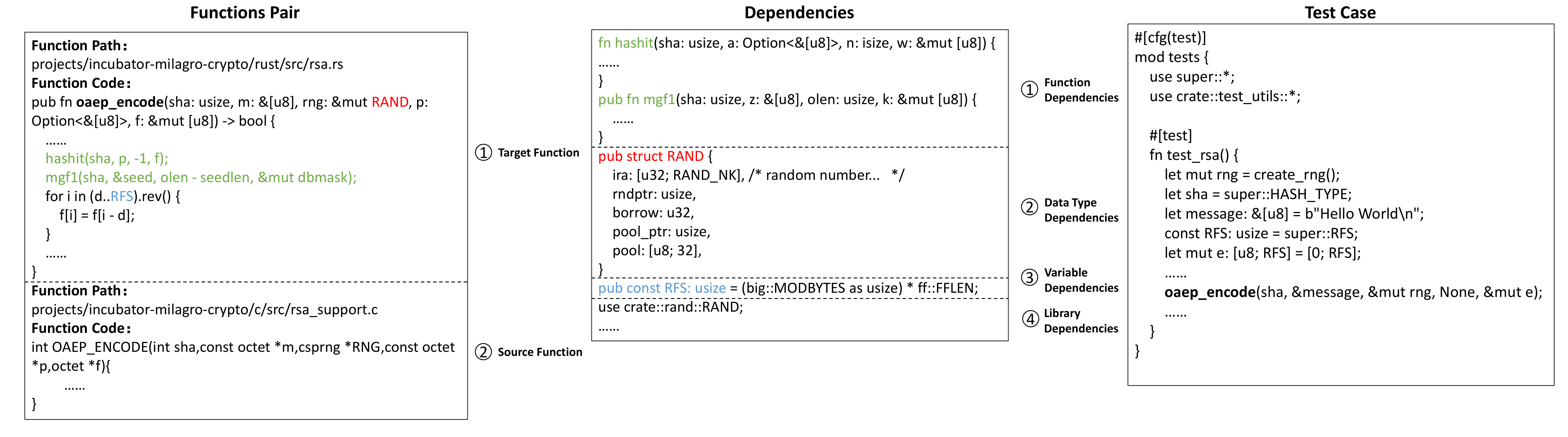 In this benchmark, the source function, target function signature, and associated dependencies serve as input, with the goal for LLMs to generate a complete target function. The correctness of this generated function can then be verified using the associated test cases.