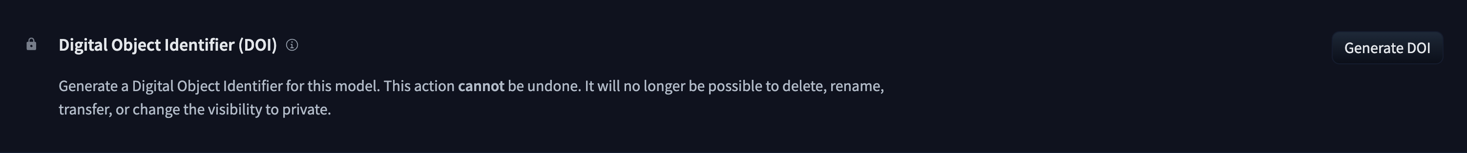 The Hugging Face Hub offers the possibility to generate DOI for your models or datasets. DOIs (Digital Object Identifiers) are strings uniquely identifying a digital object, anything from articles to figures, including datasets and models. DOIs are tied to object metadata, including the object’s URL, version, creation date, description, etc. They are a commonly accepted reference to digital resources across research and academic communities; they are analogous to a book’s ISBN.