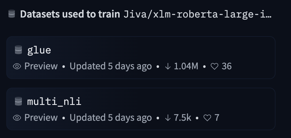 It’s up to the person who uploaded the model to include the training information! A user can specify the dataset used for training a model. If the datasets used for the model are on the Hub, the uploader may have included them in the model card’s metadata. In that case, the datasets would be linked with a handy card on the right side of the model page: