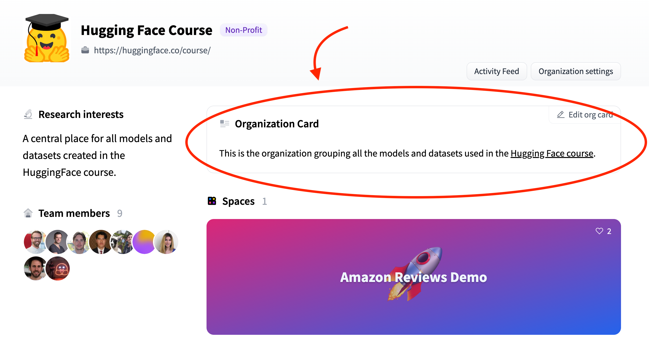 The card for the Hugging Face Course organization, shown above, contains the following HTML: