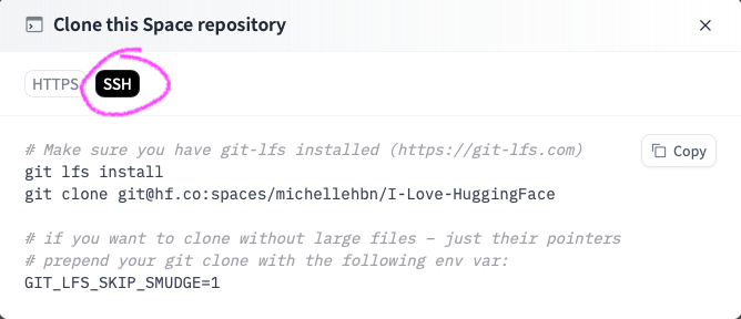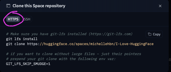Select “Clone repository”, and then you’ll be able to follow the instructions to clone the Space repo to your local machine using HTTPS or SSH.