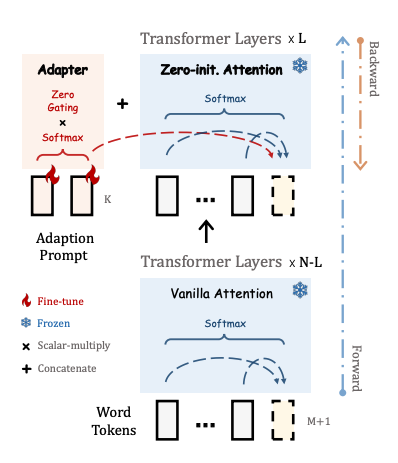 To avoid adding noise to the tokens, the adapter uses zero-initialized attention. On top of this, the adapter adds a learnable gating factor (initialized with zeros) to progressively add information to the model during training. This prevents overwhelming the model’s pretrained knowledge with the newly learned instructions.