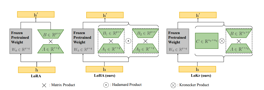 LoHa uses the Hadamard product (element-wise product) instead of the matrix product. ∆W is represented by four smaller matrices instead of two - like in LoRA - and each pair of these low-rank matrices are combined with the Hadamard product. As a result, ∆W can have the same number of trainable parameters but a higher rank and expressivity.