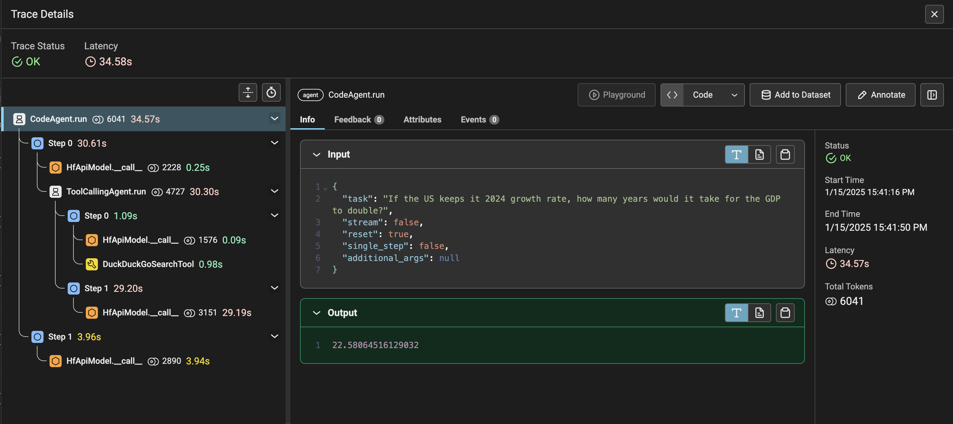 You can see that the CodeAgent called its managed ToolCallingAgent (by the way, the managed agent could have been a CodeAgent as well) to ask it to run the web search for the U.S. 2024 growth rate. Then the managed agent returned its report and the manager agent acted upon it to calculate the economy doubling time! Sweet, isn’t it?