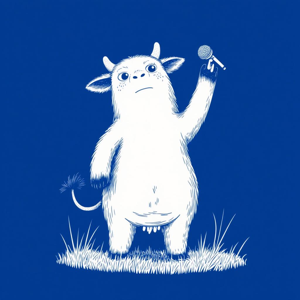 close-up portrait of a happy peaceful cow dancing and singing holding a microphone. deep blue, white lines illustration, in the style of TOK
