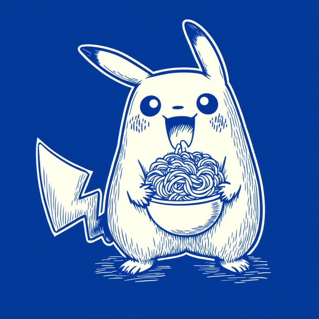 a hungry pikachu miam eating delicious ramen. deep blue, white lines illustration, in the style of TOK