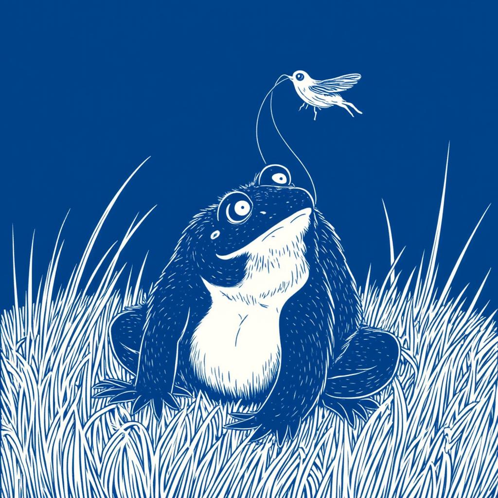a big frog chasing a fly with his tongue. deep blue, white lines illustration, in the style of TOK, 2
