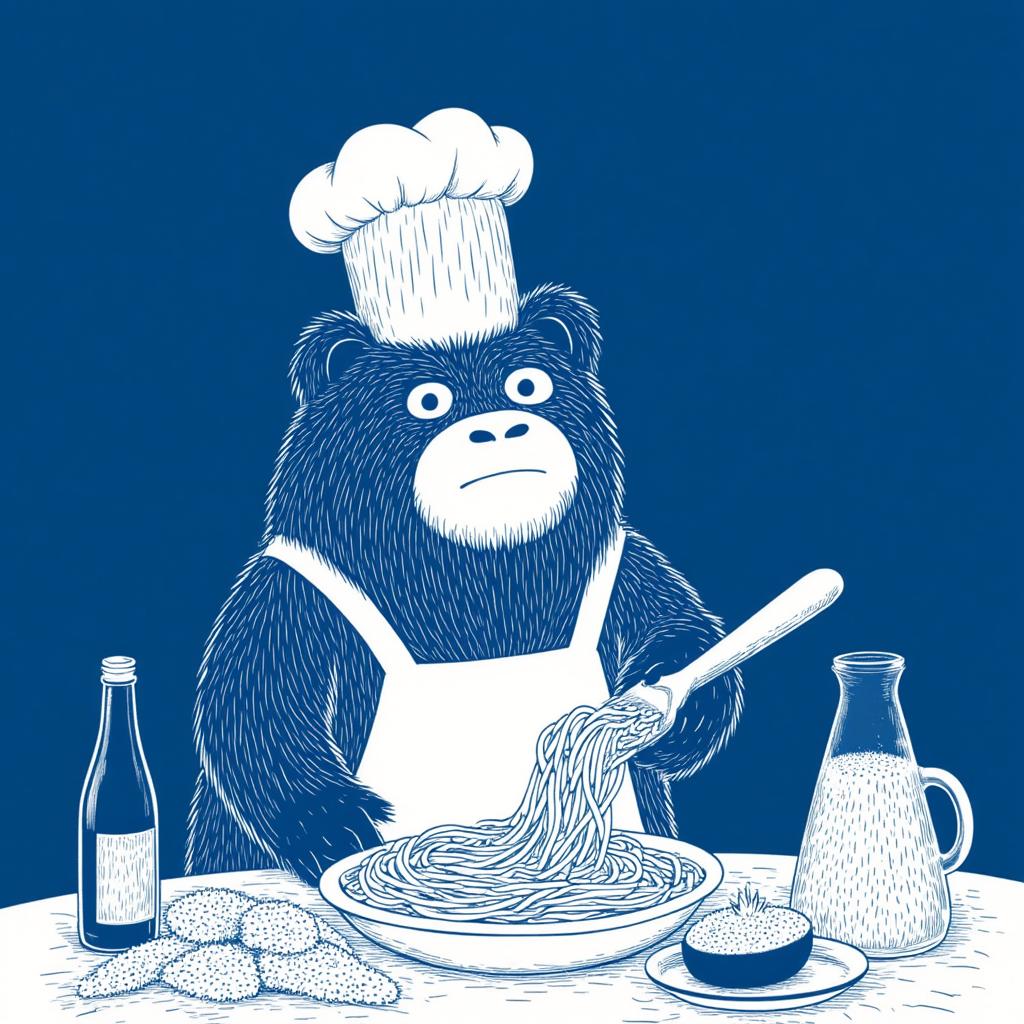 a bear chef cooking pasta. deep blue, white lines illustration, in the style of TOK