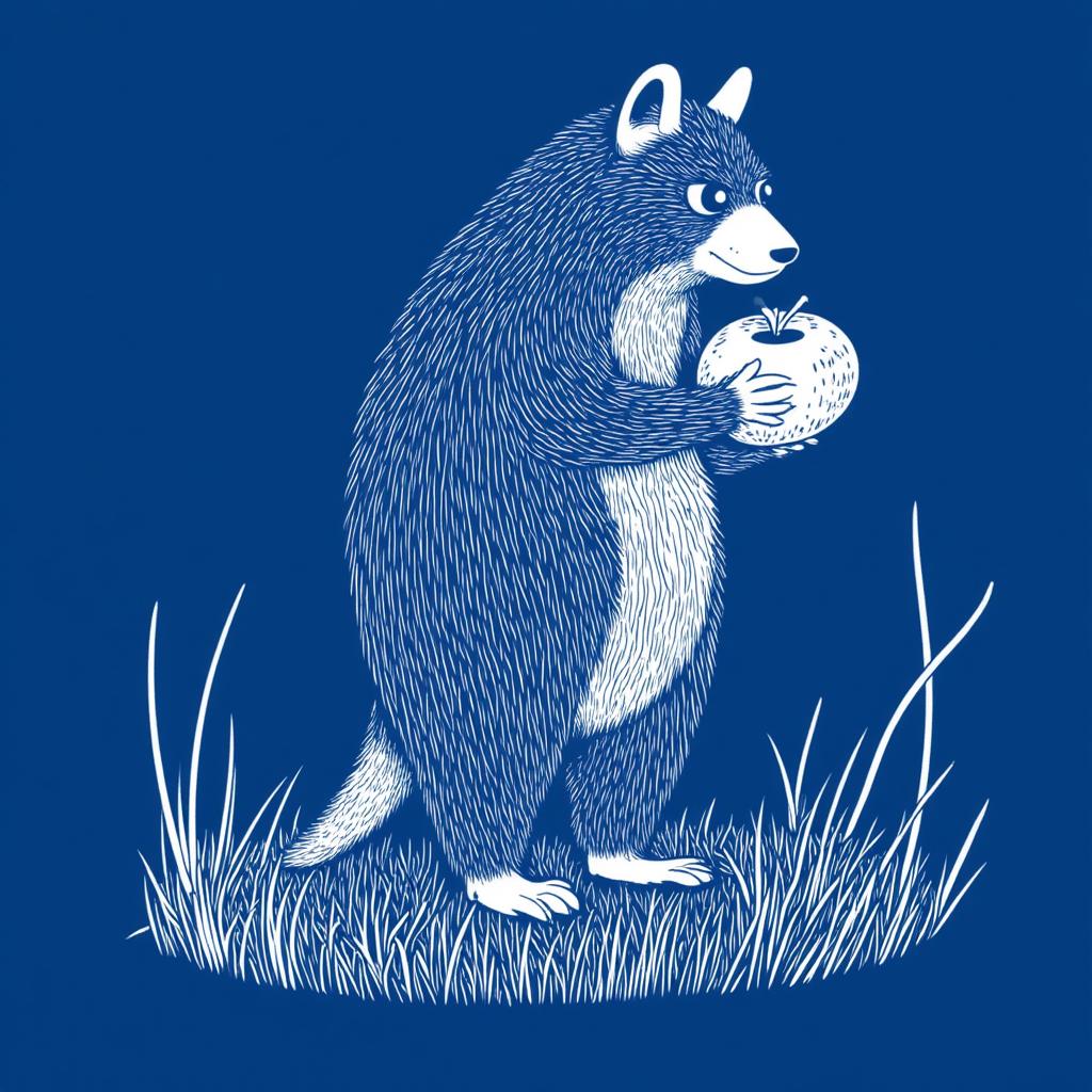 a Possum holding fruit. deep blue, white lines illustration, in the style of TOK