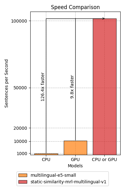 この課題を解決する新しいアプローチとして、先日公開されたTransformerモデル「ではない」 StaticEmbeddingモデルは、例えば intfloat/multilingual-e5-small (以下mE5-small)とのベンチマーク比較では85%のスコアという最低十分な性能で、何よりCPUで動作時に126倍高速に文ベクトルを作成することができる、という驚きの速度です。