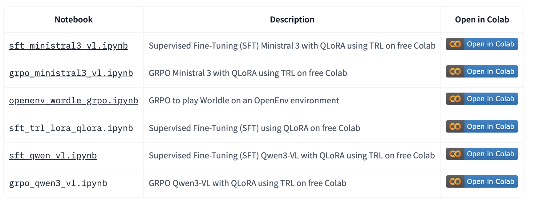 - GRPO: https://colab.research.google.com/github/huggingface/trl/blob/main/examples/notebooks/grpo_ministral3_vl.ipynb