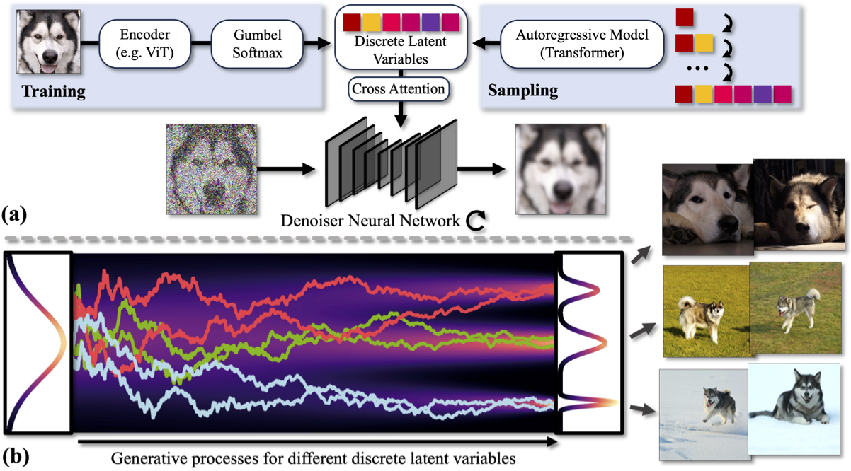 The augment diffusion models (DMs) with learnable discrete latents, inferred with an encoder, and train DMs and encoder end-to-end. The discrete latents significantly simplify learning the DM's complex noise-to-data mapping by reducing the curvature of the DM's generative ODE. An additional autoregressive transformer models the distribution of the discrete latents, a simple step because DisCo-Diff requires only few discrete variables with small codebooks. DisCo-Diff consistently improves model performance on several image synthesis tasks as well as molecular docking, and find that introducing discrete latents. For example, DisCo-Diff achieves state-of-the-art FID scores on class-conditioned ImageNet-64/128 datasets with ODE sampler.