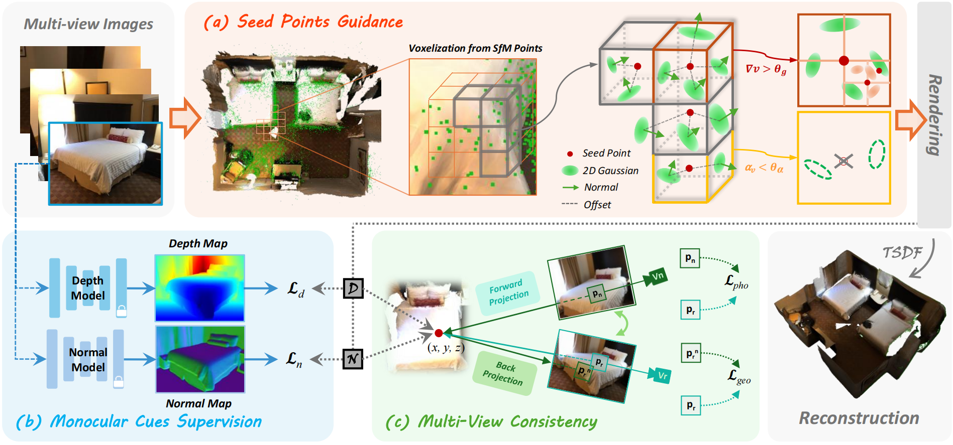 A method using 2D Gaussian Splatting combined with seed-guided mechanisms and monocular depth/normal priors achieves state-of-the-art indoor scene reconstruction.