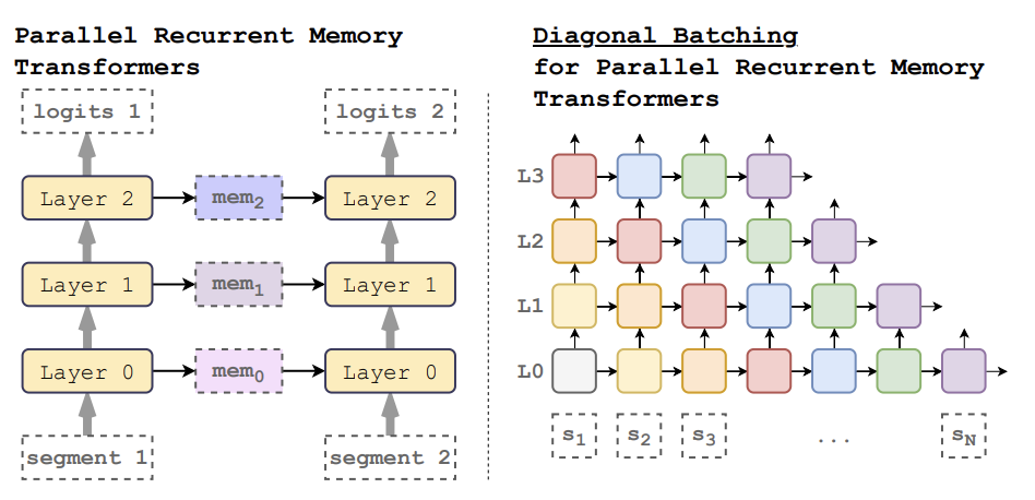 Diagonal Batching enables parallel inference in Recurrent Memory Transformers, significantly improving speed and efficiency for long-context tasks.