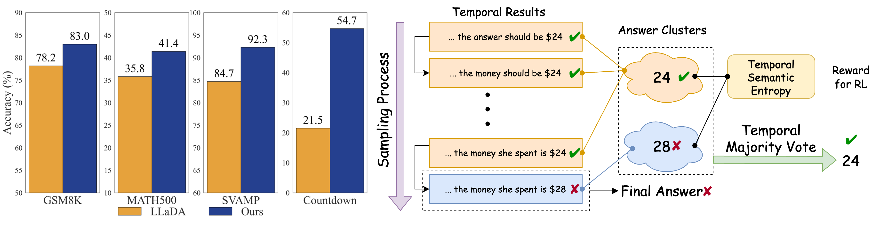 This work uncovers temporal oscillation in diffusion large language models (dLLMs), where correct answers appear mid-process but are later lost. To harness this, the authors propose Temporal Self-Consistency Voting and Temporal Consistency Reinforcement, boosting performance across multiple benchmarks.