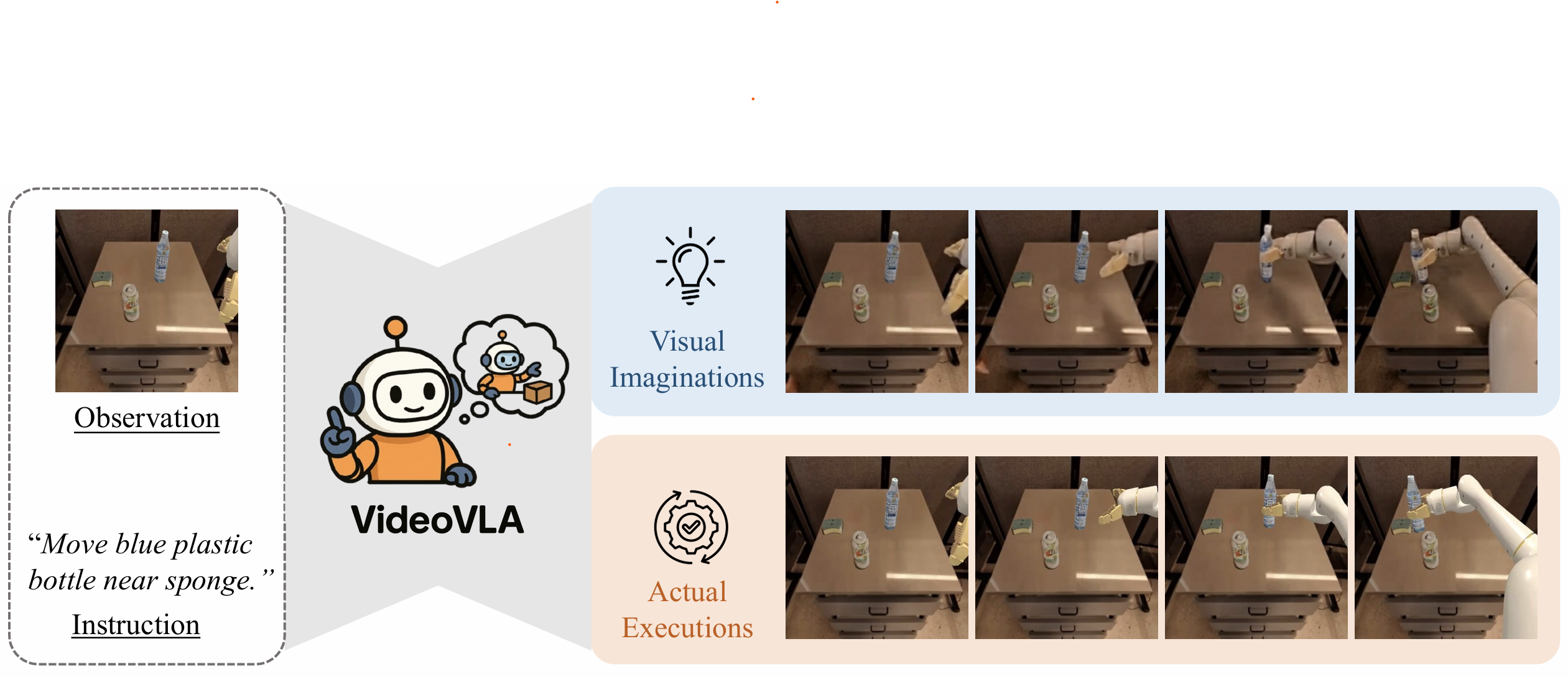 VideoVLA uses a multi-modal Diffusion Transformer to predict actions and visual outcomes from language and image inputs, enabling strong generalization in robotic manipulation tasks.