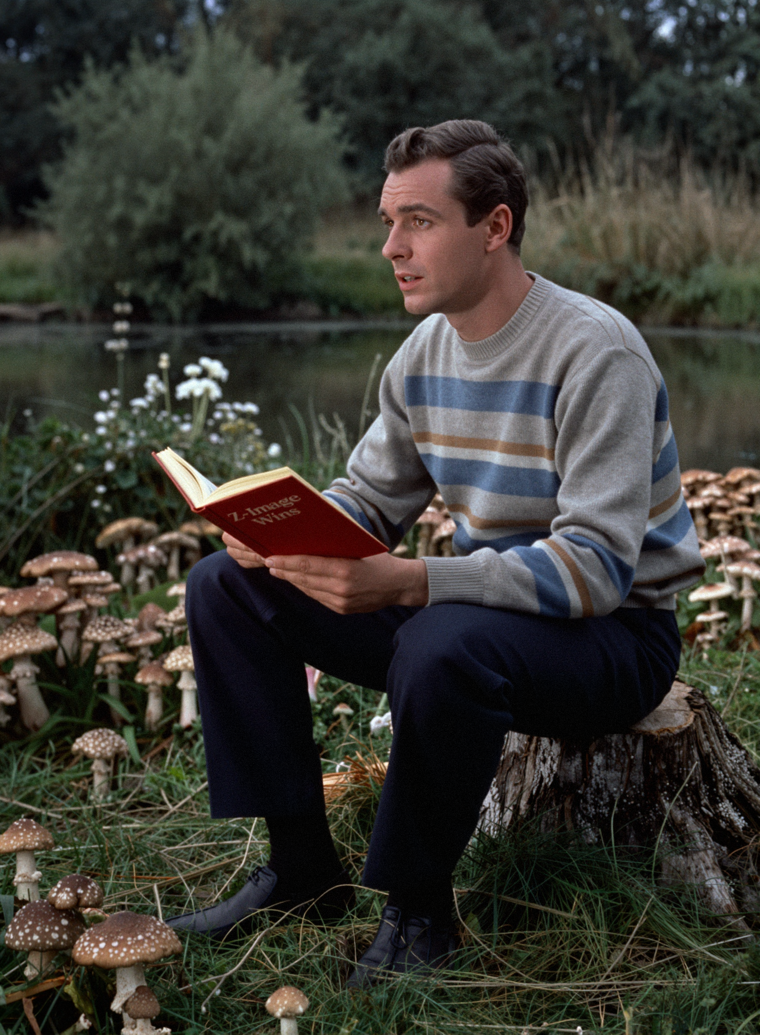 - t3chnic4lly tight shot upper body view 80mm FOV a young man with brown hair and a striped cotton sweater seated ona tree stump by a field of wild mushrooms, sitting near a pond, the pond is surrounded by flower bushes and tall trees, the dappled light creating a peaceful ambiance to the photograph. 1960s cinematic still. They are facing forward looking off to the right, he's reading a red hardcover book with the title "Z-Image Wins" 1960s style film
