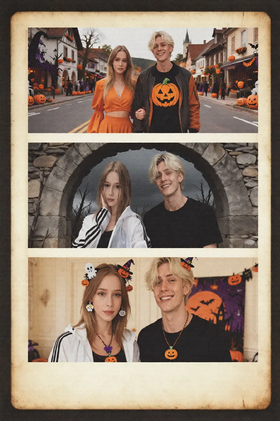 两人站在街头合照并挽着手的照片,保持两人人脸高度一致,男士穿着夹克外套,露出南瓜头的T恤,女士穿着时尚的偏橘黄色的装扮,背景是万圣节日的欧洲小镇的马路中央,万圣节节日风格